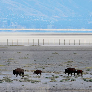 Bison walk along a section of the disappearing Great Salt Lake